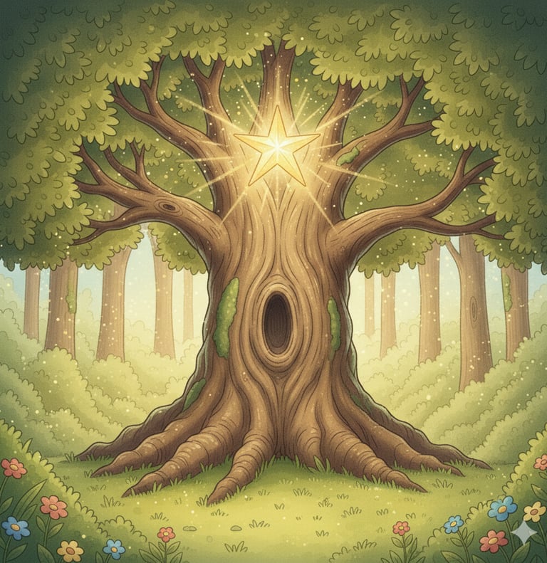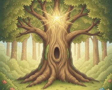 Finally, they reached the heart of the forest, a colossal oak whose branches stretched toward the heavens. Above its trunk floated the Forest Star, radiant and warm, casting a golden glow that made the entire glade shimmer. Ferdinand approached, his heart pounding not with fear, but with understanding and love for his friends and the forest.