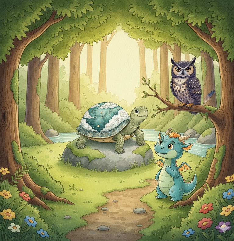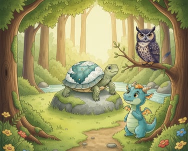 Eventually, they reached a wide, sun-dappled glade where Marabel, the slow and wise turtle, waited. “I wondered when you would arrive,” she said, her voice measured and calm. “The star is near, but it tests more than courage. It seeks the purity of heart, the wisdom to care, and the patience to endure.”